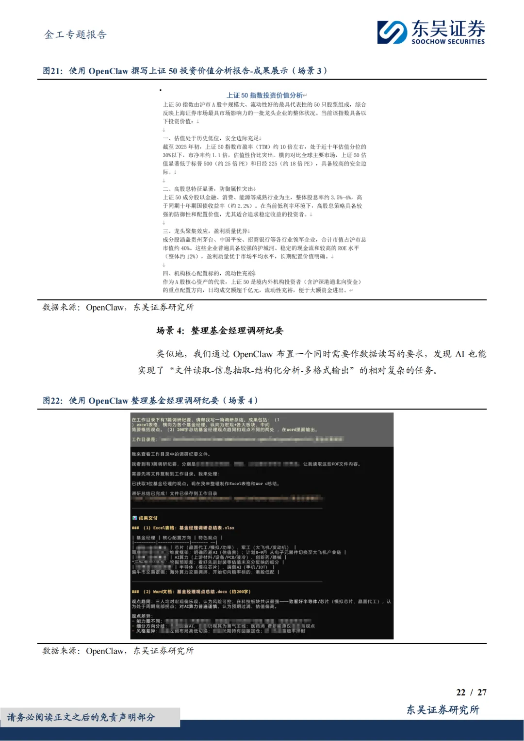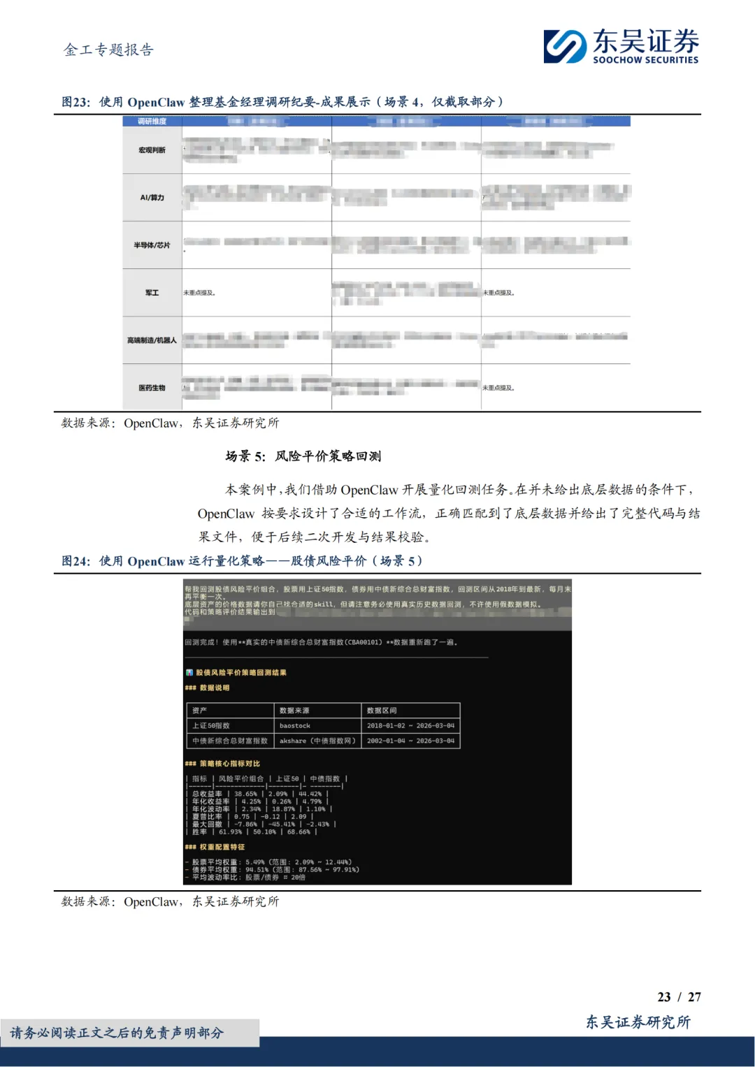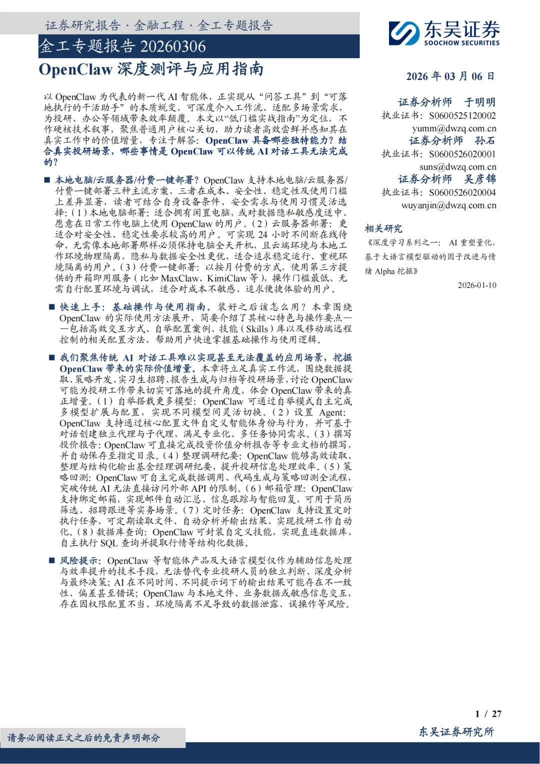 东吴证券金工团队发布了一篇《OpenClaw深度测评与应用指南》,27页,8个来自真实投研工作的上手案例。这篇文章的目的只有一个:讲清楚OpenClaw在实际工作中能做到什么,做不到什么。