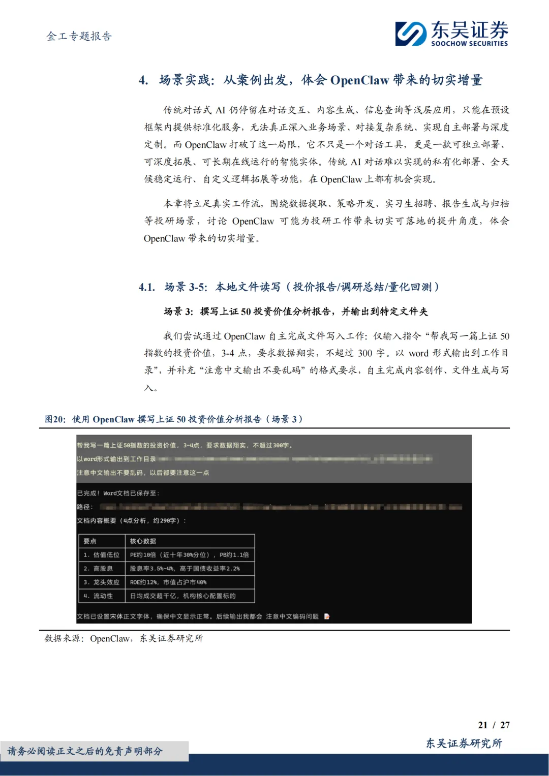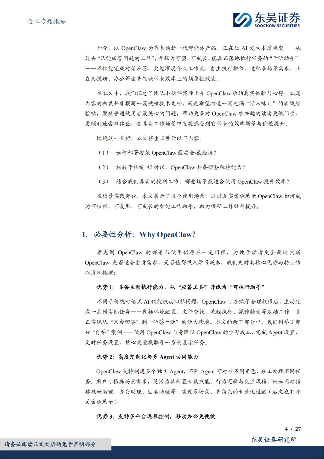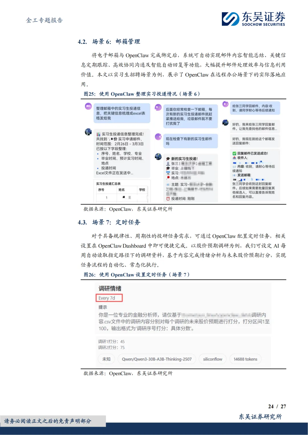 东吴证券金工团队发布了一篇《OpenClaw深度测评与应用指南》,27页,8个来自真实投研工作的上手案例。这篇文章的目的只有一个:讲清楚OpenClaw在实际工作中能做到什么,做不到什么。