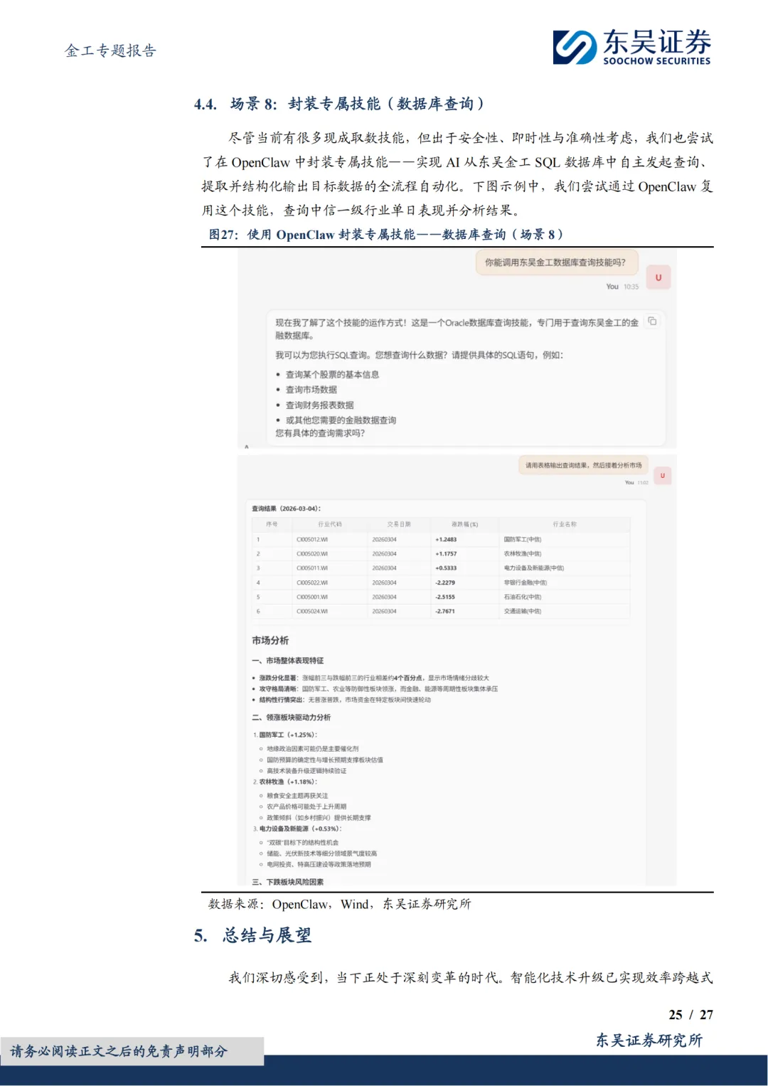 东吴团队自己开发了一个Skill,让OpenClaw直连内部SQL数据库,自主发起查询、提取中信一级行业日度数据并结构化输出。报告的言下之意是:任何重复性的数据获取工作,都可以封装成一个可复用的技能模块,一次封装、长期复用。