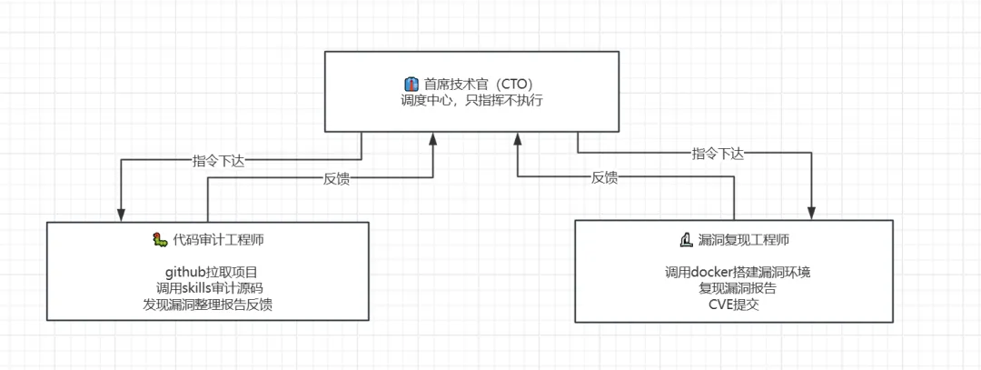 CTO 不写代码、不审计代码、不发 HTTP 包。他的唯一工作是:拆任务、派活、盯进度、收结果。整个流水线从「搜索 GitHub 项目」开始: