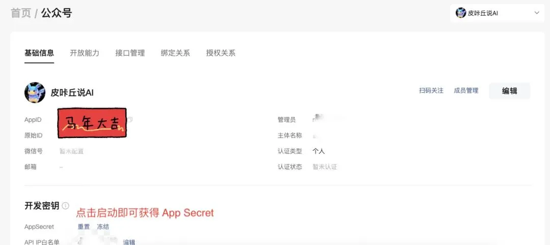 访问 https://developers.weixin.qq.com/ 进入「公众号」→「基本信息」 记录 AppID 和 AppSecret 设置 IP 白名单(添加服务器 IP)