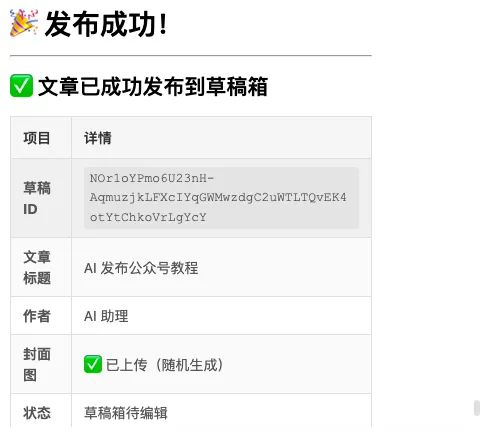 请帮我把这篇文章发布到公众号草稿箱 标题:AI发布公众号教程 内容:[文章内容] 封面图:[图片链接]