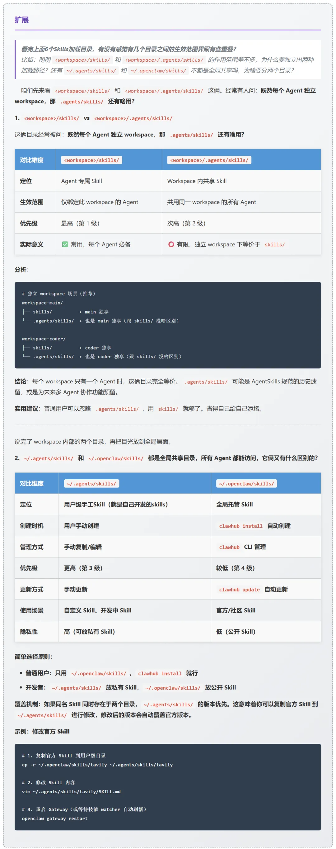 # 独立 workspace 场景(推荐)workspace-main/├── skills/ ← main 独享└── .agents/skills/ ← 也是 main 独享(跟 skills/ 没啥区别)workspace-coder/├── skills/ ← coder 独享└── .agents/skills/ ← 也是 coder 独享(跟 skills/ 没啥区别) 说实话,个人觉得 <workspace>/skills/ 和 <workspace>/.agents/skills/ 当前是完全等价的,在官方推荐的独立 workspace 架构下,<workspace>/.agents/skills/的意义非常有限。