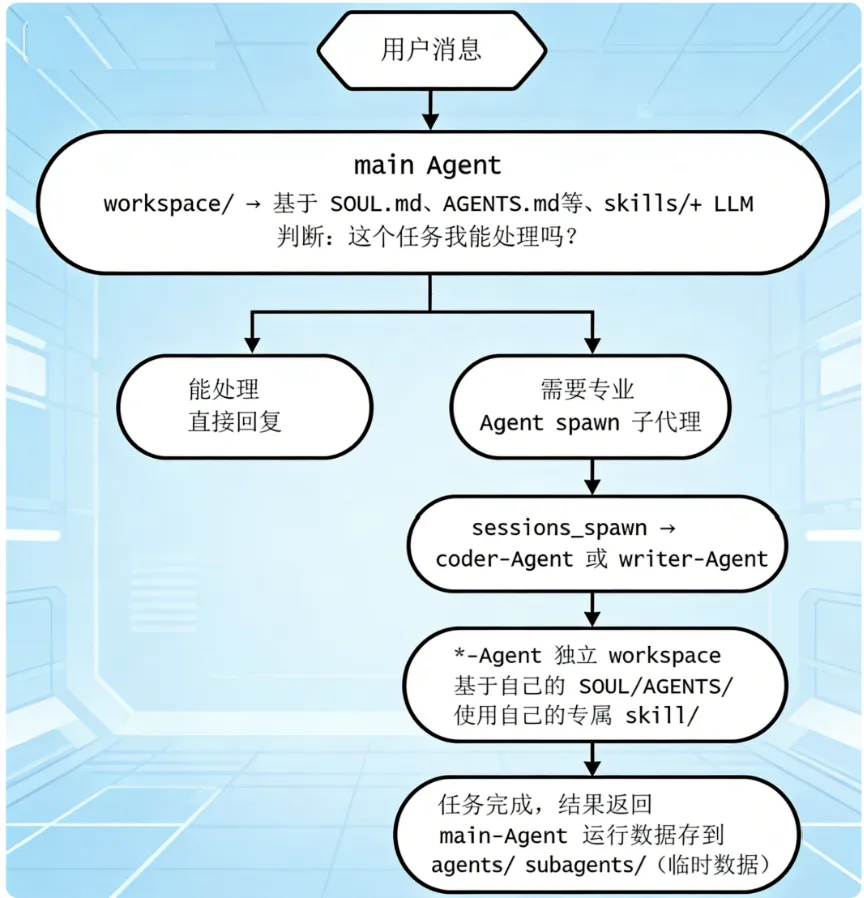 子 Agent 启动时,会读取自己独立 workspace 的配置,使用自己的专属 Skill,而不是继承 main Agent 的配置。就像你派程序员去写代码,他用的是自己的 IDE 配置,不是你的。