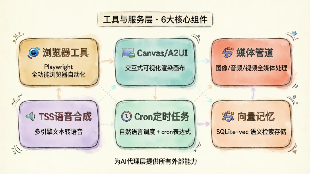 职责: 为 AI 代理层提供所有"外部能力":浏览器控制、画布渲染、媒体处理、语音合成、定时任务、记忆检索等