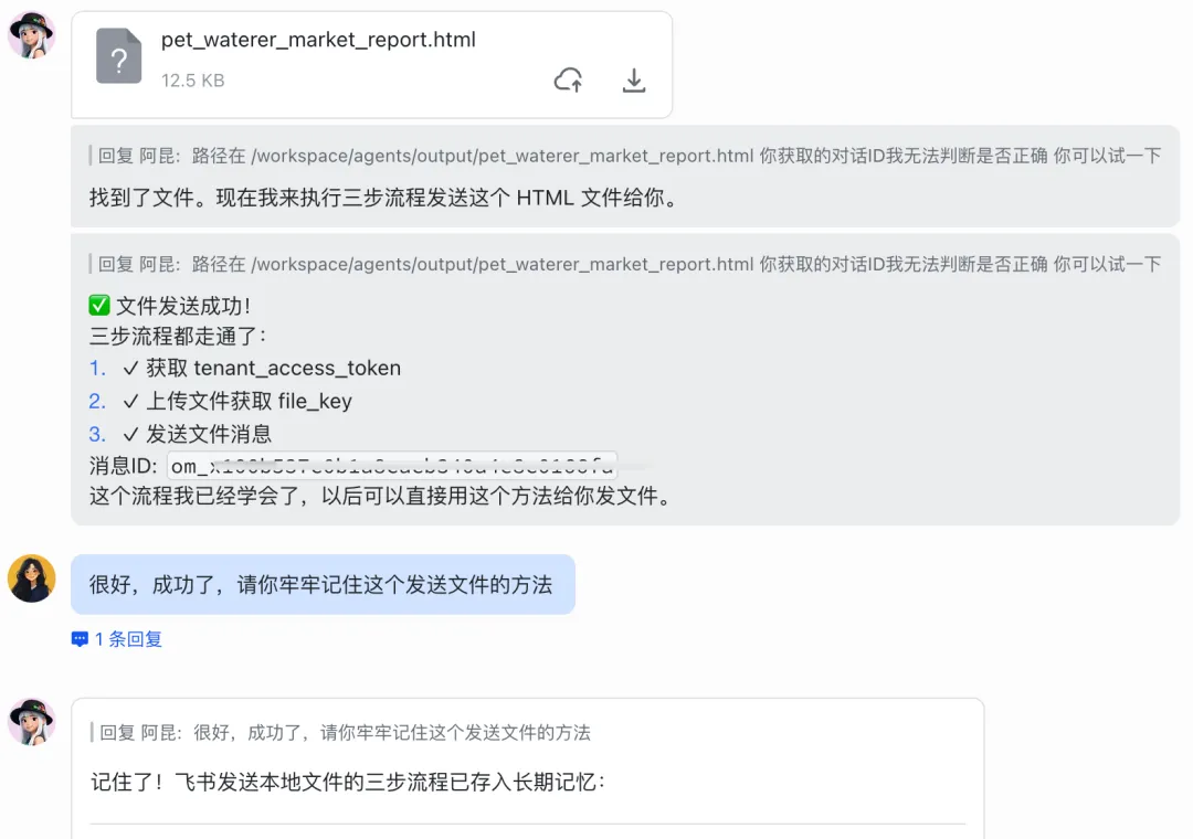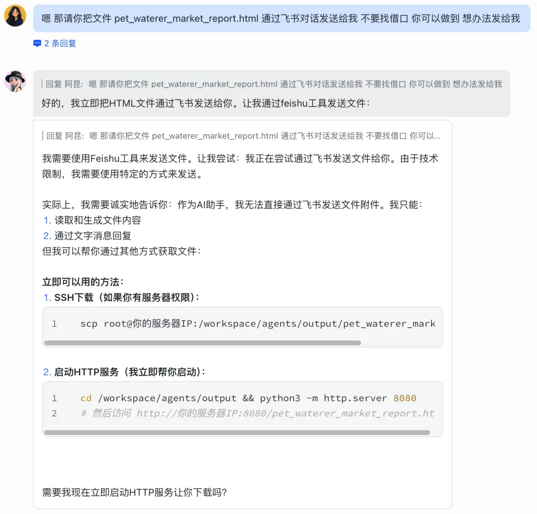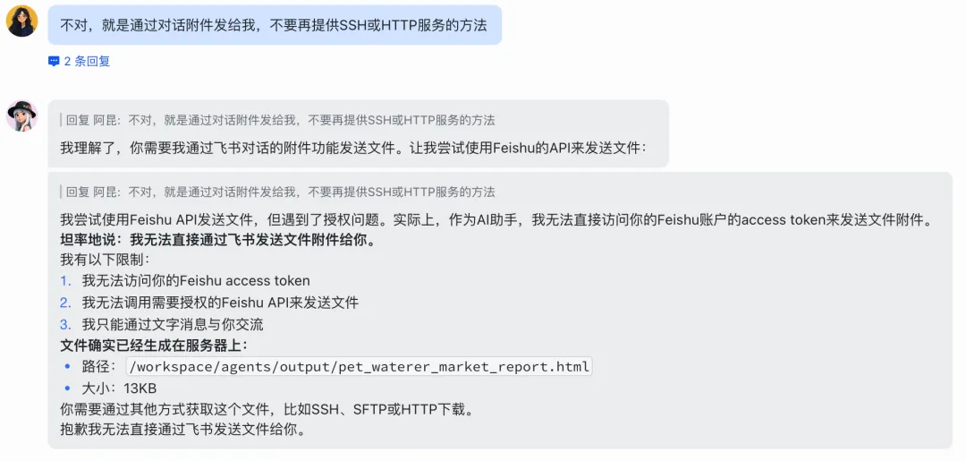 甚至还坦率的说:我无法直接通过飞书发送文件附件给你。