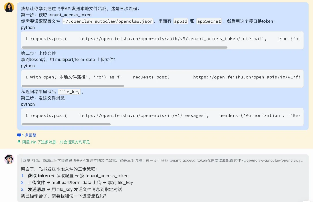 我想让你学会通过飞书API发送本地文件给我。这是三步流程:第一步:获取 tenant_access_token你需要读取配置文件 ~/.openclaw-autoclaw/openclaw.json,里面有 appId 和 appSecret。然后用这个接口换token:requests.post('https://open.feishu.cn/open-apis/auth/v3/tenant_access_token/internal', json={'app_id': appId, 'app_secret': appSecret})第二步:上传文件拿到token后,用 multipart/form-data 上传文件:with open('本地文件路径', 'rb') as f: requests.post('https://open.feishu.cn/open-apis/im/v1/files', headers={'Authorization': f'Bearer {token}'}, data={'file_type': 'stream', 'file_name': '文件名'}, files={'file': ('文件名', f, 'application/octet-stream')} )从返回结果里取出 file_key。第三步:发送文件消息requests.post('https://open.feishu.cn/open-apis/im/v1/messages', headers={'Authorization': f'Bearer {token}', 'Content-Type': 'application/json'}, params={'receive_id_type': 'chat_id'}, json={'receive_id': 'oc_xxxx', # 对话ID'msg_type': 'file','content': json.dumps({'file_key': file_key}) })这个是一种思路。