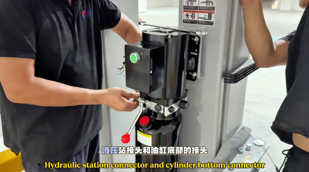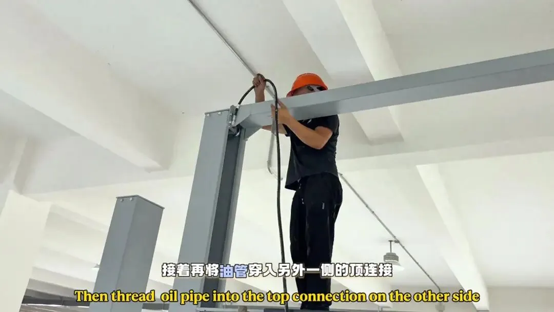 ·卡扣锁好后,如视频中所示,记住油管两边均是延伸,往立柱底部的油缸接头处,随即将油管接头连接,在油缸底部的接头中锁紧油管螺丝。