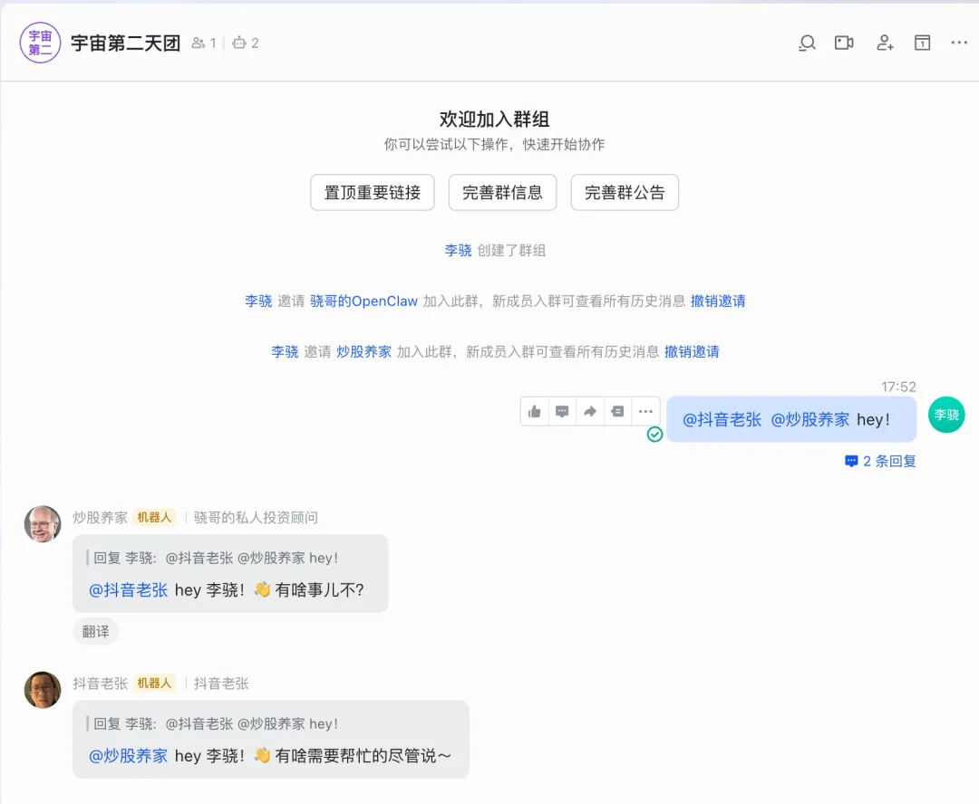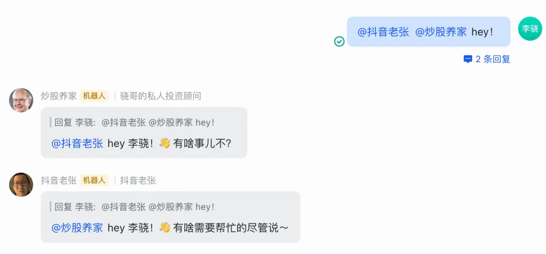 "bindings": [ { "agentId": "main", "match": { "channel": "feishu", "accountId": "main" } }, { "agentId": "chaogu", "match": { "channel": "feishu", "accountId": "chaogu" } } ],效果如下👇