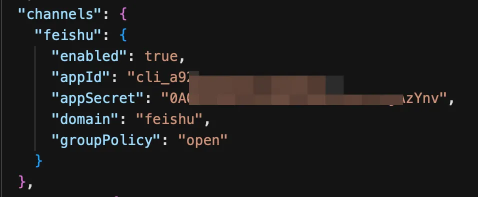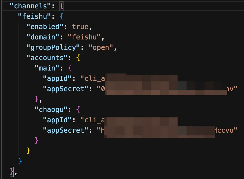 "channels": { "feishu": { "enabled": true, "domain": "feishu", "groupPolicy": "open", "accounts": { // 新增accounts字段 "main": { // 之前的bot "appId": "", // 之前bot的appId "appSecret": "" // 之前bot的appSecret }, "chaogu": { // 新申请的botId "appId": "", // 新bot的appId "appSecret": "" // 新bot的appSecret } } } },把刚刚在飞书新申请的机器人的App ID和App Secret,填进去,效果如下👇