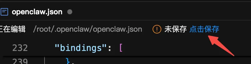 "channels": { "feishu": { "enabled": true, "domain": "feishu", "groupPolicy": "open", "accounts": { "main": { "appId": "", "appSecret": "" }, "chaogu": { "appId": "", "appSecret": "" } } } }, "bindings": [ { "agentId": "main", "match": { "channel": "feishu", "accountId": "main" } }, { "agentId": "chaogu", "match": { "channel": "feishu", "accountId": "chaogu" } } ], "tools": { "agentToAgent": { "enabled": true, "allow": ["main", "chaogu"] }, "sessions": { "visibility": "all" } }记得保存哟~