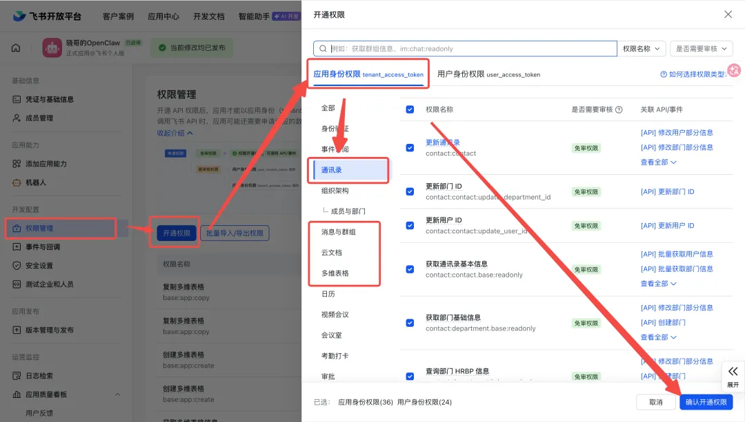 左侧边栏「权限管理」→ 「开通权限」,把“通讯录”、“消息与群组”、“云文档”和“多维表格”下面所有权限全开了,然后点击「确认」
