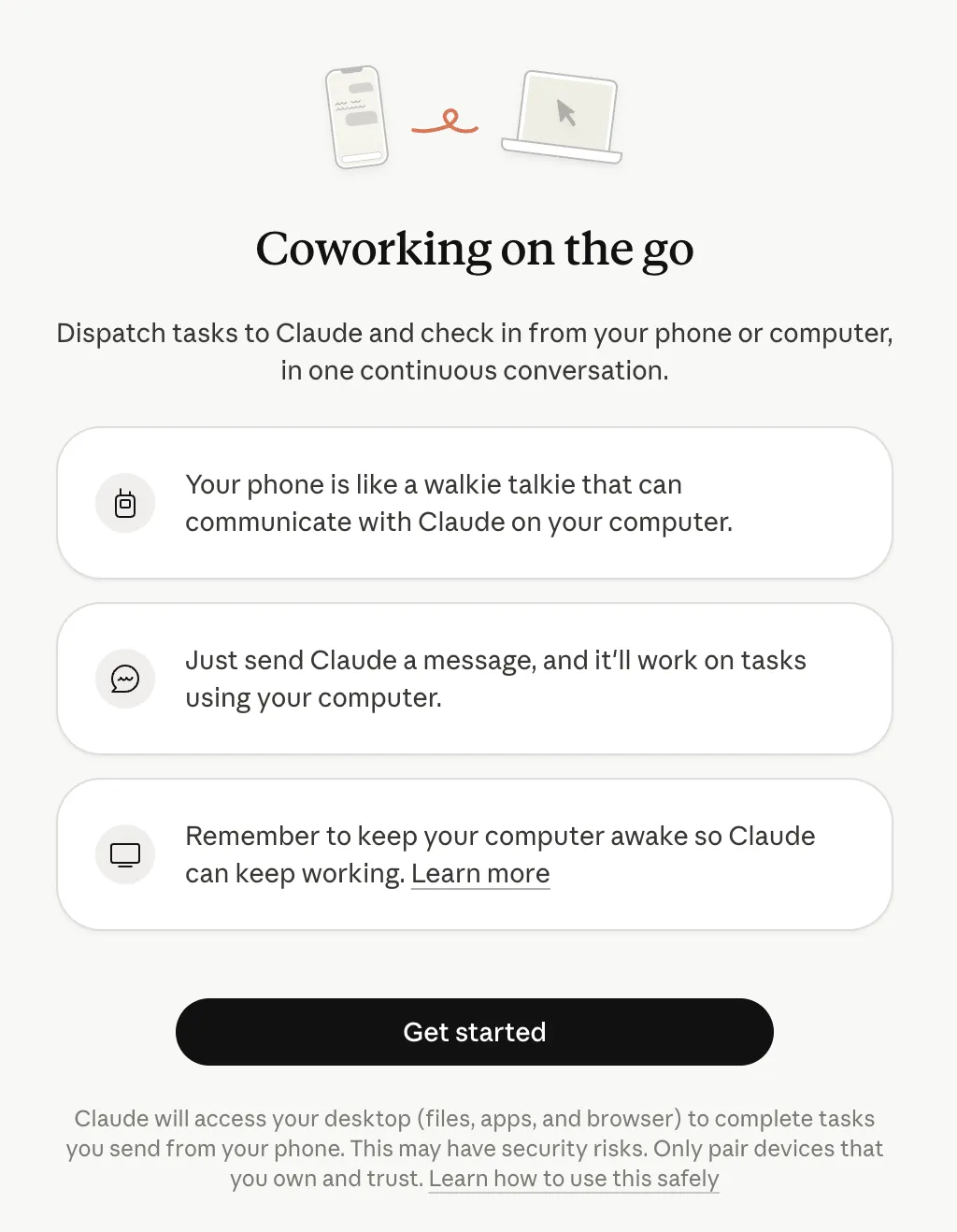 找到入口: 打开 Cowork,点击左侧边栏的 “Dispatch”,点击 “Get started”