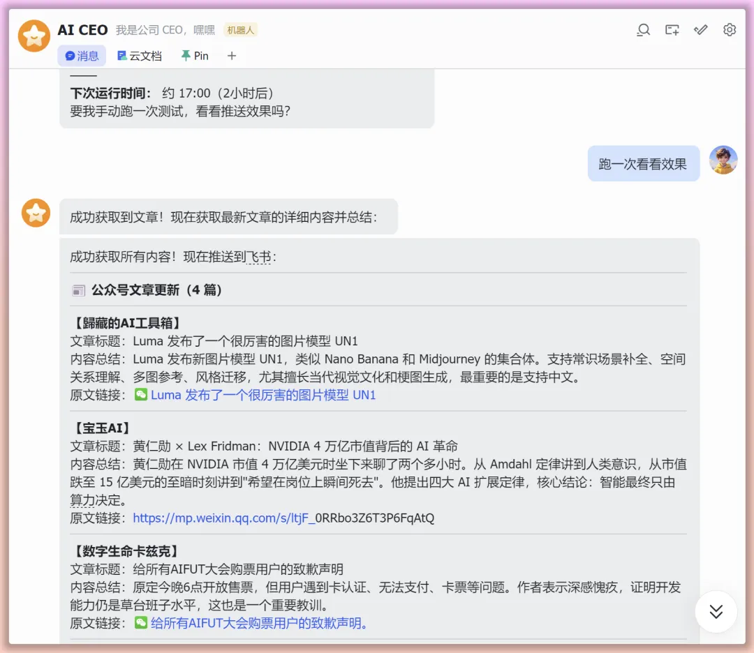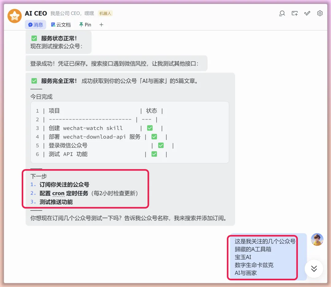 你再让小龙虾设置一个定时任务,就可以自动定时给你推公众号了。