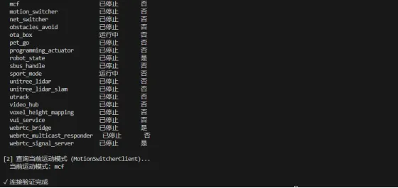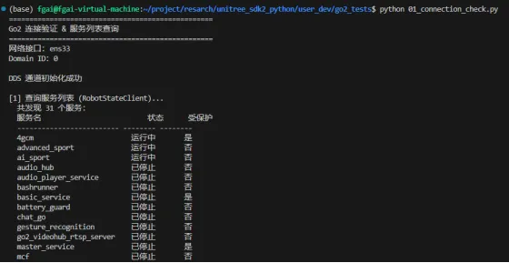 (base) fgai@fgai-virtual-machine:~/project/resarch/unitree_sdk2_python/user_dev/go2_tests$ python 01_connection_check.py==================================================Go2 连接验证 & 服务列表查询==================================================网络接口:ens33Domain ID:0DDS 通道初始化成功[1] 查询服务列表 (RobotStateClient)...共发现 31 个服务:服务名 状态 受保护------------------------- -------- --------4gcm 运行中 是advanced_sport 运行中 否ai_sport 运行中 否audio_hub 已停止 否audio_player_service 已停止 否bashrunner 已停止 否basic_service 已停止 是battery_guard 已停止 否chat_go 已停止 否gesture_recognition 已停止 否go2_videohub_rtsp_server 已停止 否master_service 已停止 是mcf 已停止 否motion_switcher 已停止 否net_switcher 已停止 否obstacles_avoid 已停止 否ota_box 运行中 否pet_go 已停止 否programming_actuator 已停止 否robot_state 已停止 是sbus_handle 已停止 否sport_mode 运行中 否unitree_lidar 已停止 否unitree_lidar_slam 已停止 否utrack 已停止 否video_hub 已停止 否voxel_height_mapping 已停止 否vui_service 已停止 否webrtc_bridge 已停止 是webrtc_multicast_responder 已停止 否webrtc_signal_server 已停止 是[2] 查询当前运动模式 (MotionSwitcherClient)...当前运动模式:mcf✓ 连接验证完成
