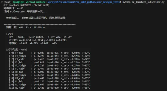 (base) fgai@fgai-virtual-machine:~/project/resarch/unitree_sdk2_python/user_dev/go2_tests$ python 02_lowstate_subscriber.pyGo2 LowState 实时监控(Ctrl+C 退出)网络接口:ens33订阅 rt/lowstate,每秒刷新一次...等待数据... (检查机器人是否开机、网络是否连通)=======================================================消息计数:500 Tick:1194965 ms[IMU]RPY : roll= -1.21° pitch= -1.03° yaw= -41.57°四元数: w=-0.9348 x=0.0131 y=0.0047 z=0.3549陀螺仪: +0.001 +0.006 -0.019 rad/s[关节角度 (rad)][ 0] FR_hip : q=-0.028 dq=+0.004 τ_est= +0.02Nm T=33°C[ 1] FR_thigh : q=+0.725 dq=+0.031 τ_est= -0.59Nm T=32°C[ 2] FR_calf : q=-1.415 dq=-0.038 τ_est= +3.60Nm T=35°C[ 3] FL_hip : q=+0.017 dq=-0.027 τ_est= -0.17Nm T=32°C[ 4] FL_thigh : q=+0.727 dq=+0.012 τ_est= -0.22Nm T=33°C[ 5] FL_calf : q=-1.497 dq=-0.032 τ_est= +4.08Nm T=35°C[ 6] RR_hip : q=-0.007 dq=+0.031 τ_est= +4.01Nm T=51°C[ 7] RR_thigh : q=+0.765 dq=+0.031 τ_est= +1.78Nm T=35°C[ 8] RR_calf : q=-1.449 dq=-0.028 τ_est= +5.41Nm T=37°C[ 9] RL_hip : q=+0.125 dq=+0.031 τ_est= -4.08Nm T=51°C[10] RL_thigh : q=+0.697 dq=+0.054 τ_est= +0.96Nm T=34°C[11] RL_calf : q=-1.423 dq=+0.008 τ_est= +4.65Nm T=37°C[足端力] (原始值)FR: 38 (est: 0)FL: 42 (est: 0)RR: 44 (est: 0)RL: 16 (est: 0)[电池]电压: 31.62 V 电流: 1.06 A电量: 85% 循环次数: 5