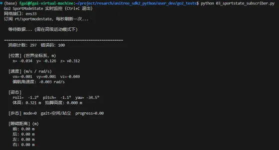 运行结果如下:(base) fgai@fgai-virtual-machine:~/project/resarch/unitree_sdk2_python/user_dev/go2_tests$ python 03_sportstate_subscriber.pyGo2 SportModeState 实时监控(Ctrl+C 退出)网络接口:ens33订阅 rt/sportmodestate,每秒刷新一次...等待数据... (需在高级运动模式下)=======================================================消息计数:297 错误码:100[位置] (世界坐标系,m)x= -0.034 y= -0.126 z= +0.312[速度] (m/s / rad/s)vx=-0.001 vy=+0.001 vz=-0.049偏航角速度: -0.003 rad/s[姿态]roll= -1.2° pitch= -1.1° yaw= -34.5°体高: 0.321 m 抬脚高度: 0.000 m[步态] mode=0 gait=空闲/站立 progress=0.00[障碍距离] (m)前: 0.00 m后: 0.00 m左: 0.00 m右: 0.00 m