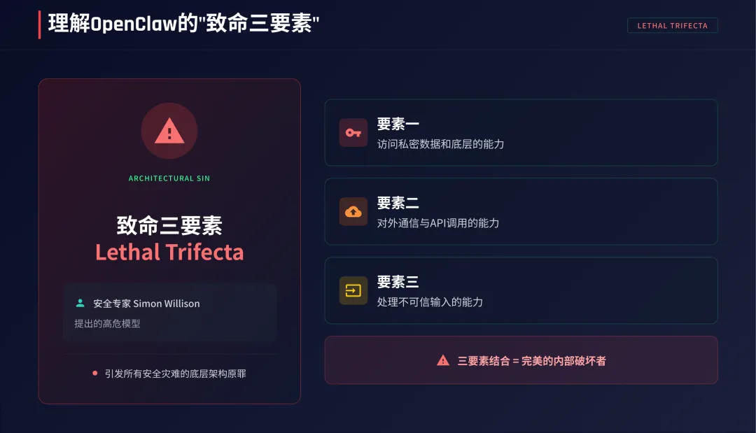 OpenClaw之所以能颠覆生产力,是因为它赋予了AI三项“超能力”,但这恰恰构成了安全界的“原罪”: