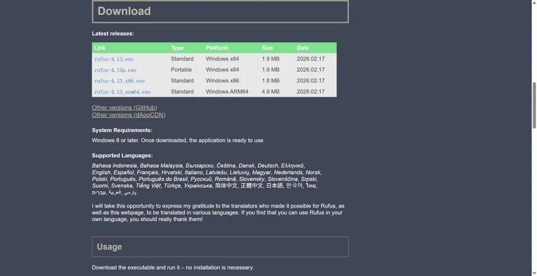 下载完成后,你会得到一个.iso结尾的文件,这就是我们要用的系统安装包。现在我们需要把这个.iso文件"烧录"到U盘里,让U盘变成一个可以启动电脑的"启动盘"。- 下载Rufus(它是免费的,而且不用安装,下载下来就能用)