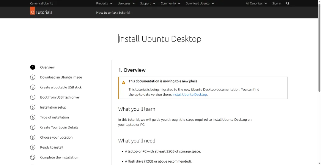 重启的时候,记得把U盘拔出来,不然又会从U盘启动了。(习惯图片引导的可以去官网,https://ubuntu.com/tutorials/install-ubuntu-desktop)刚进入Ubuntu,你可能会觉得有点陌生,但别慌,其实跟Windows差不多。### 打开软件- 点左下角那个"九个点"的图标,就可以看到所有已安装的软件- 或者按键盘上的"Win键",直接搜索你想打开的软件### 上网- 左边任务栏上就有Firefox浏览器,点开就能用- 第一次打开可能会问你要不要设为默认浏览器,选"是"就行### 安装新软件- 点左边任务栏上的"Ubuntu软件"(那个橙色的购物袋图标)- 里面有各种软件,微信、WPS、VS Code都有,直接点"安装"就行- 或者也可以在网上下载.deb格式的安装包,双击就能装### 文件管理- 左边任务栏上那个文件夹图标,就是文件管理器- 你的文档、下载、桌面都在里面,跟Windows差不多### 关机重启- 点右上角的电源图标,就可以选择关机或重启