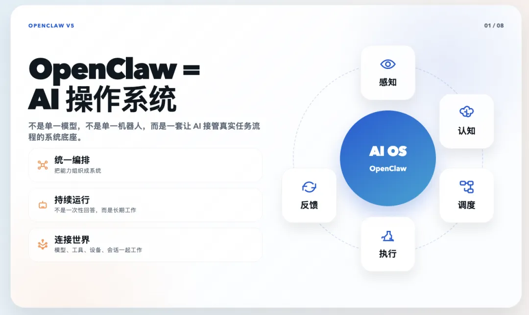 图中间是 OpenClaw,也就是 AI 操作系统的核心;外围一圈,分别是感知、认知、调度、执行、反馈。