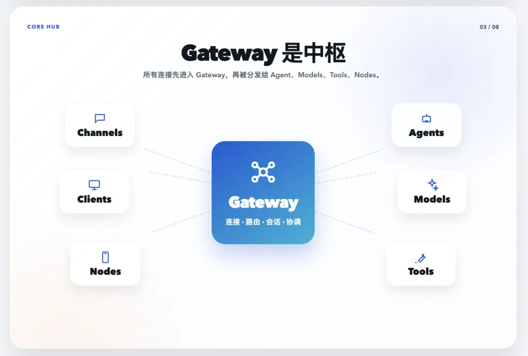 你可以看到,左边各种 Channels、Clients、Nodes,右边各种 Agents、Models、Tools,全部都围着中间这个 Gateway 在转。