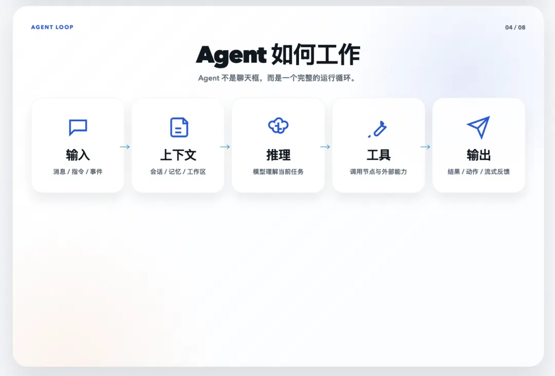 这张图就很清楚:先有输入,比如消息、指令或者事件;然后读取上下文,包括会话、记忆和工作区;接着进入推理阶段,由模型理解当前任务;理解完之后,再调用工具、节点或者外部能力;最后输出结果、动作,或者流式反馈。