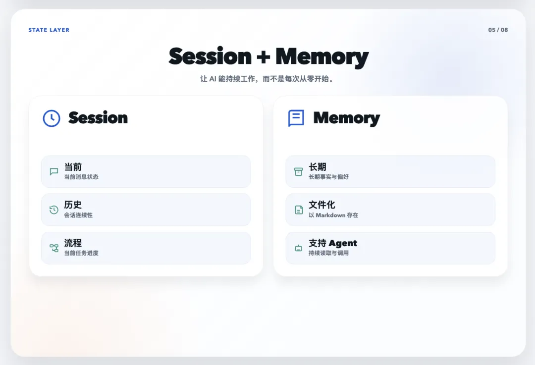 有了这两层,AI 才有可能真正“持续工作”,而不是每次开新会话都像重装系统一样从头开始。