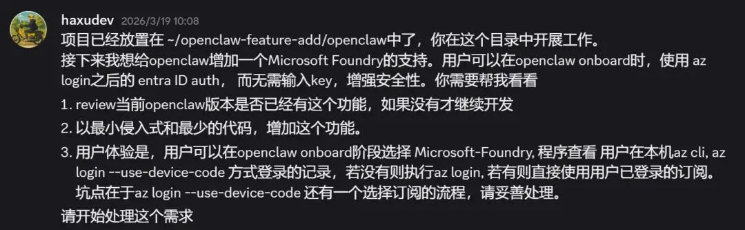 2. 我的 Coding Agent 负责实现:分析 OpenClaw 现有 provider 架构,编写 microsoft-foundry provider 扩展、onboarding 交互流程、Azure CLI 集成、模型路由、测试用例。