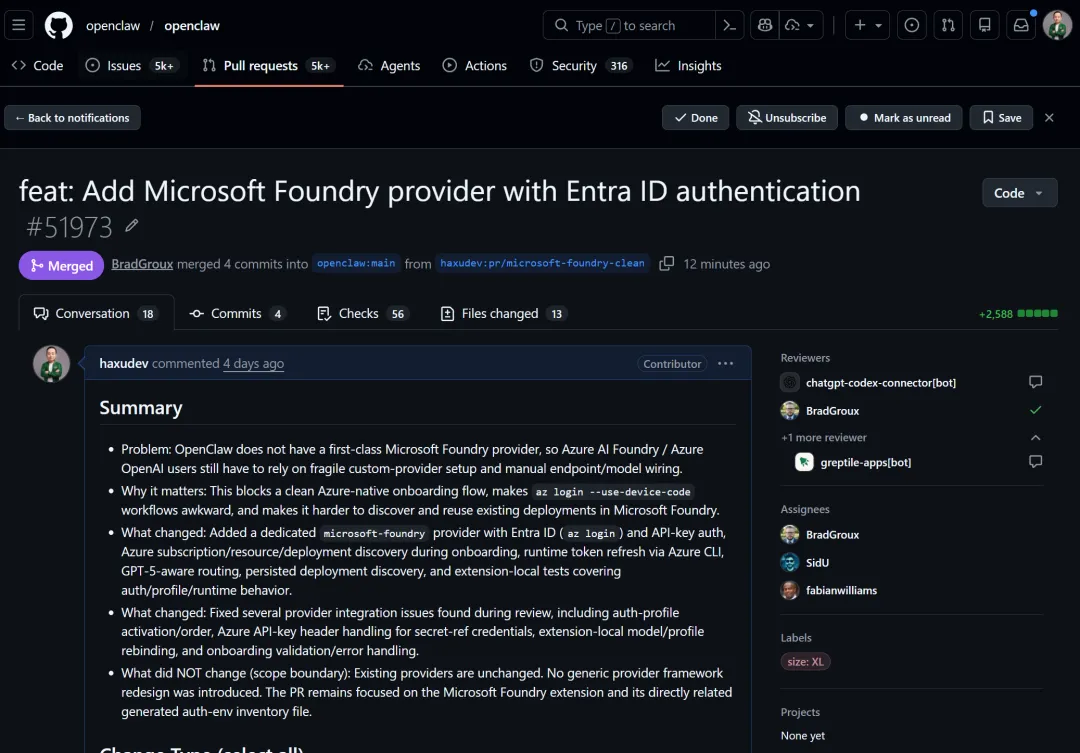 • 新增 microsoft-foundry provider:OpenClaw 现在原生支持 Azure AI Foundry / Azure OpenAI 作为模型提供者