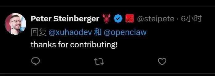 PR 合并后,OpenClaw 的创始人 Peter Steinberger 在 X(Twitter)上亲自回复了我: