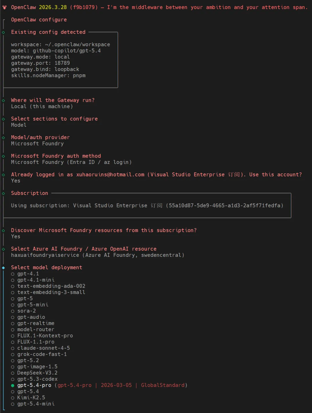 ▲ OpenClaw 2026.3.28 配置界面,Model/auth provider 已支持 Microsoft Foundry