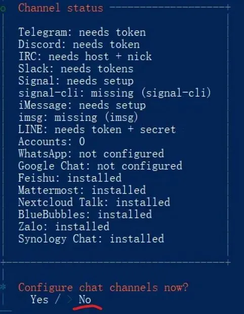 暂时不配置Channel, 选择No, 回车继续
