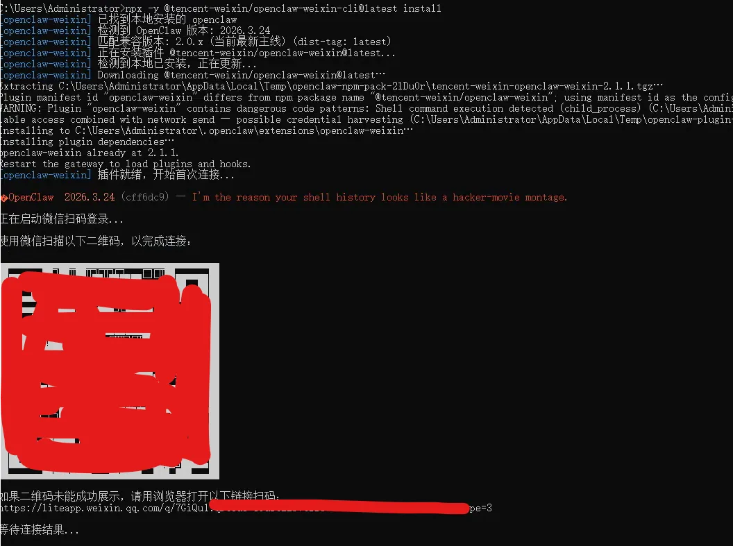 npx -y @tencent-weixin/openclaw-weixin-cli@latest install等待出现二维码