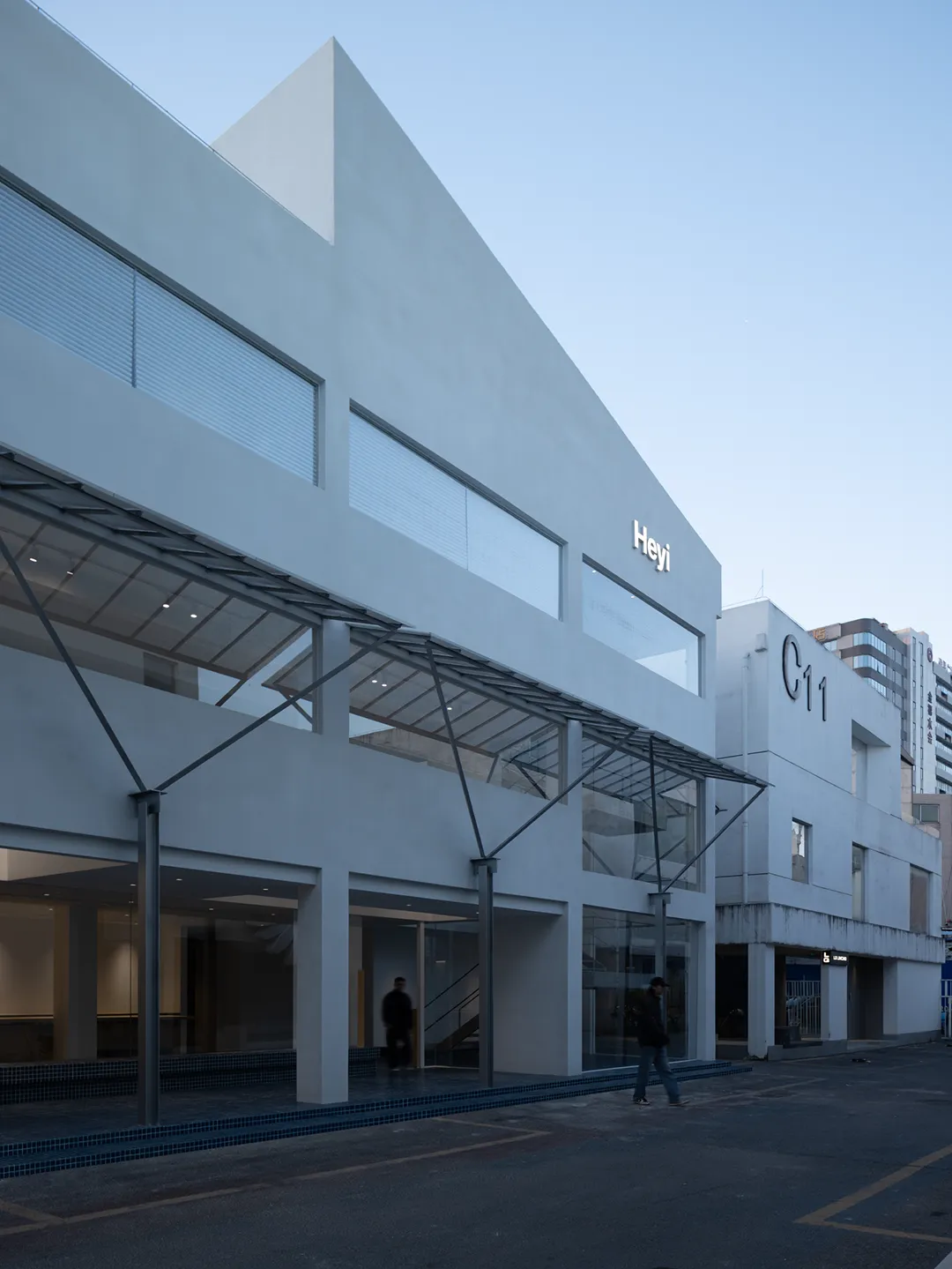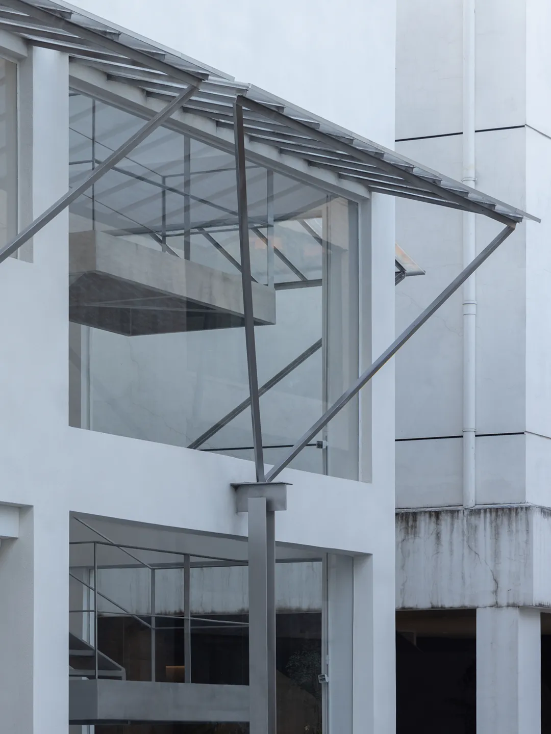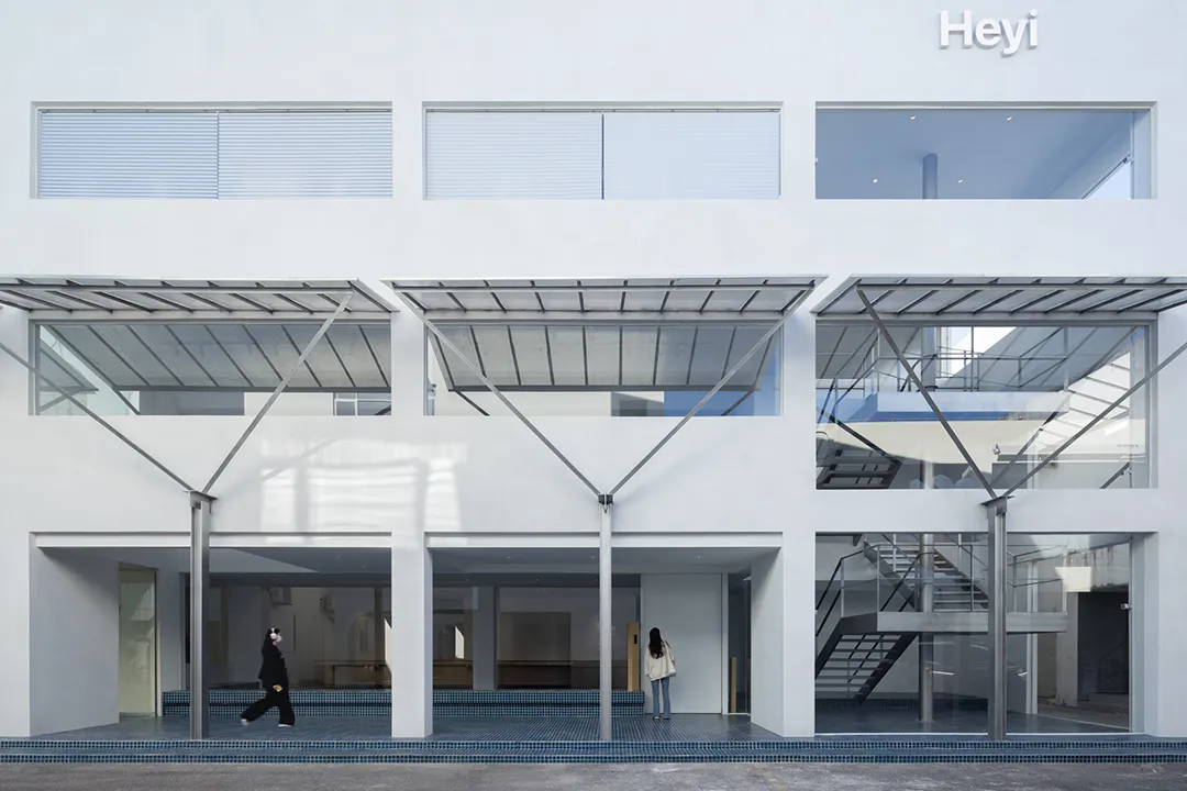 在二层立面设计挑檐,向街面延伸1.5米,同时配合纵向轴线的设计关系,在后退的4米空间内设计了几组挑空。自此,人在进入这栋建筑时有了呼吸感,也使整栋建筑在作为办公空间的同时与所在街区形成一定的连接,带来一定量的公共属性,檐下躲雨、等候、交谈等行为使整个建筑在一种日常的生活状态中变得生动。