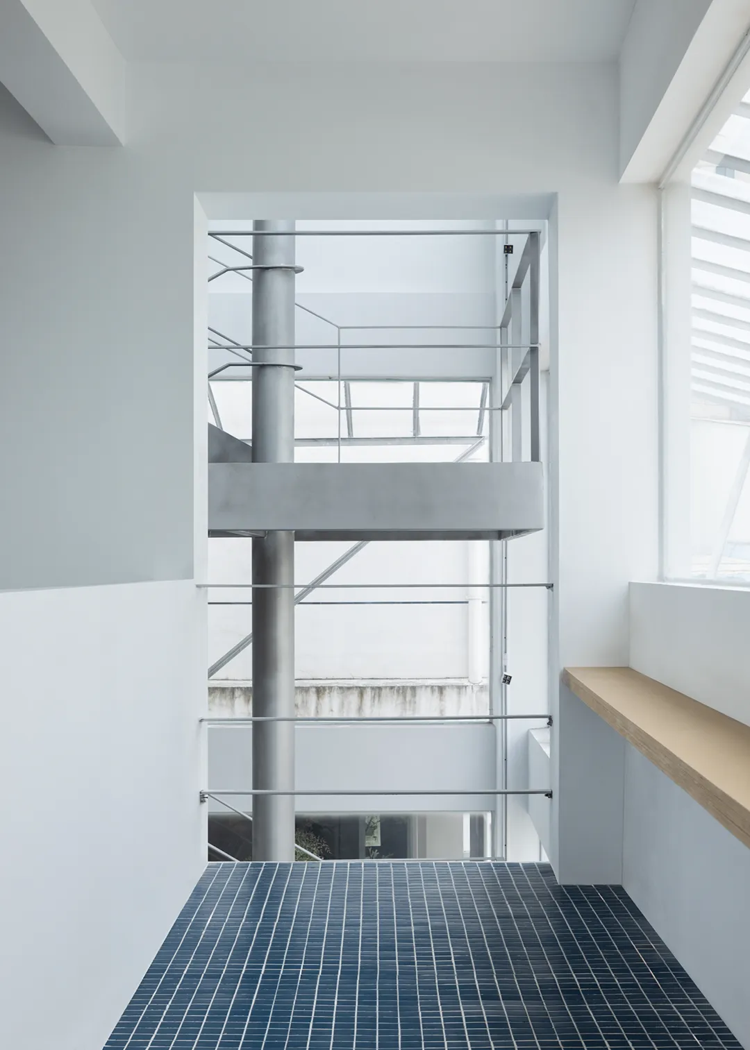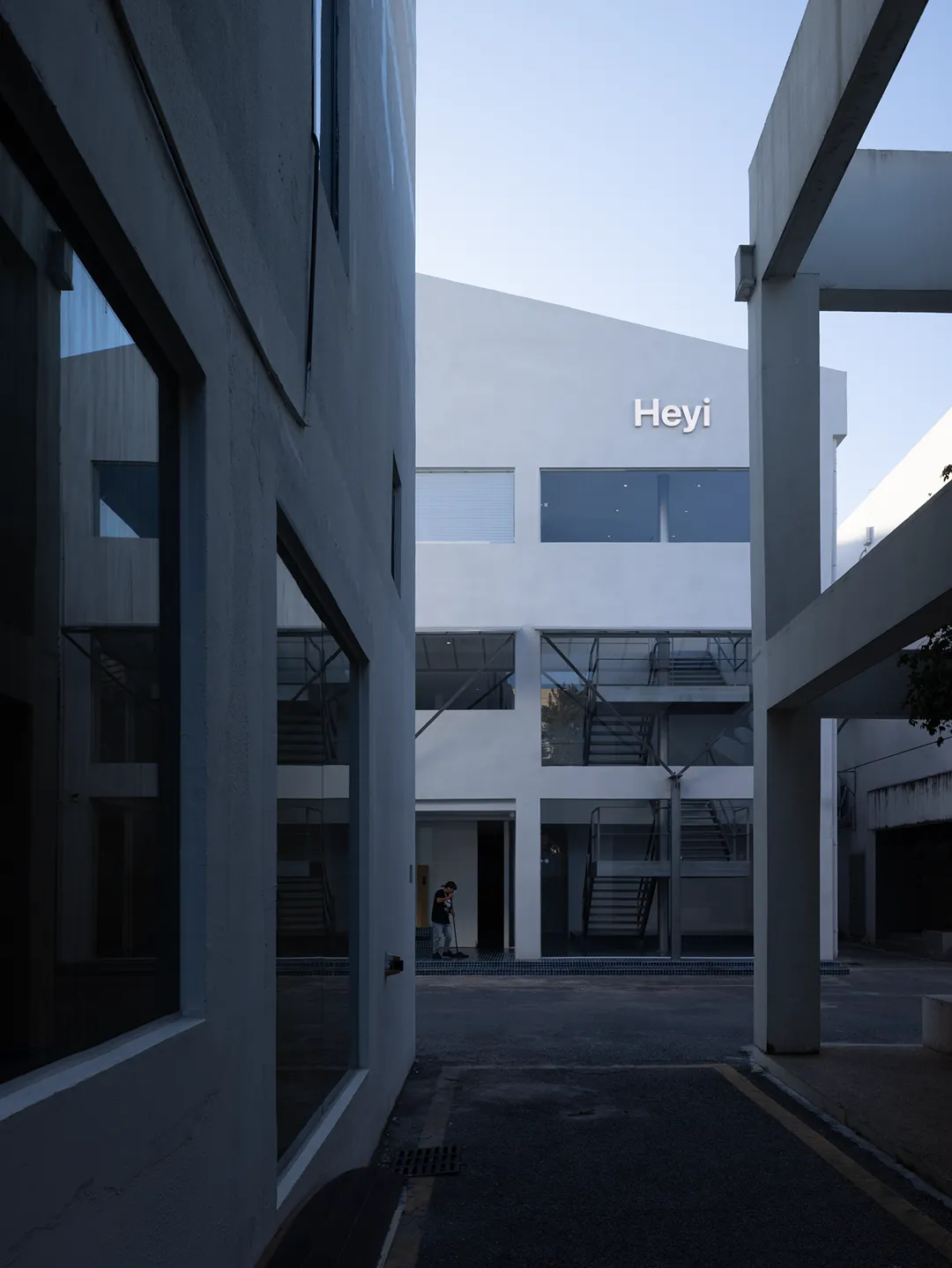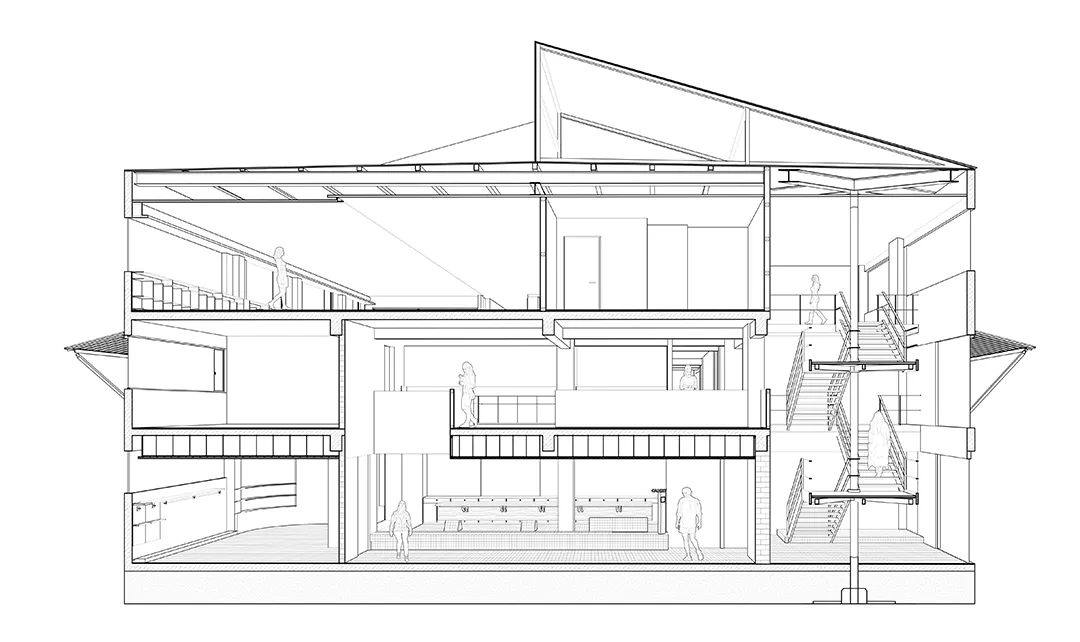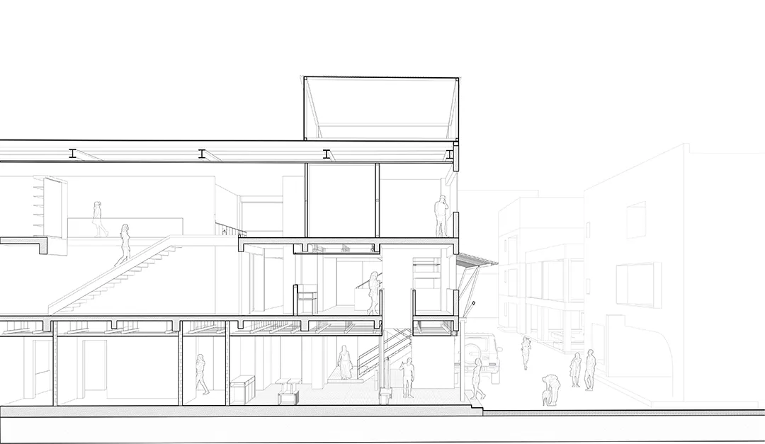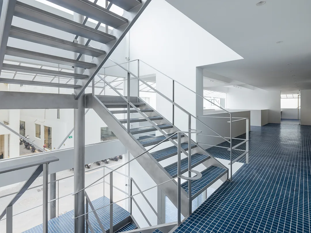 将楼梯从整体功能机制中解构,成为一个独立的单元,采用单立柱悬挑结构,以敞开的方式给予街道积极的回应,与街面形成相互渗透的状态,从而使楼梯成为这一街区的符号。