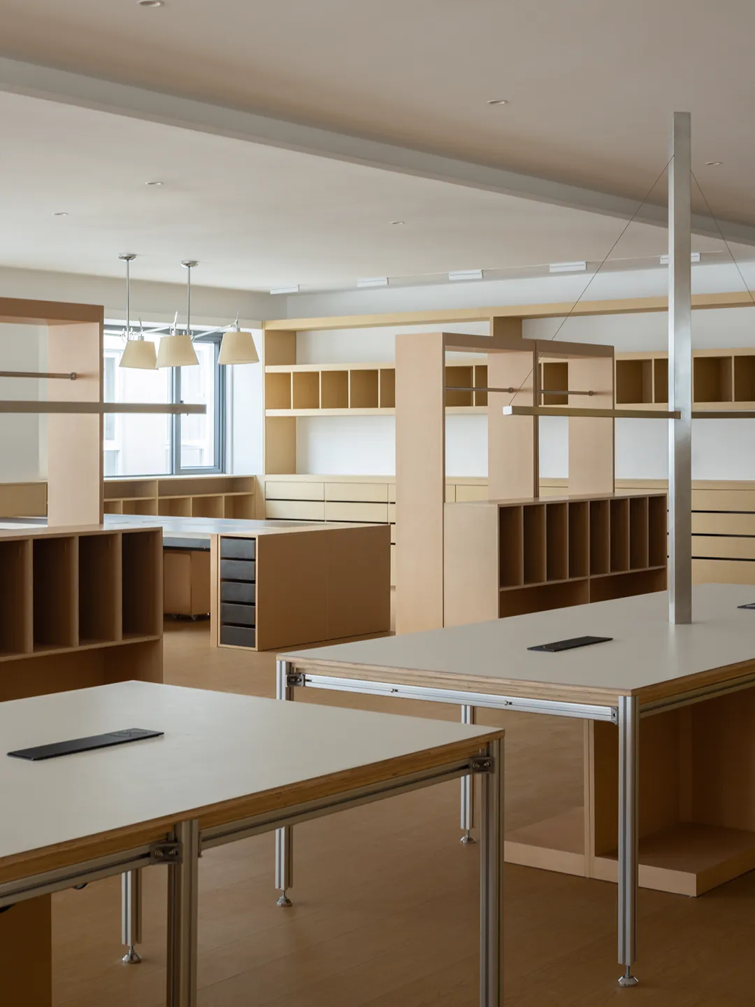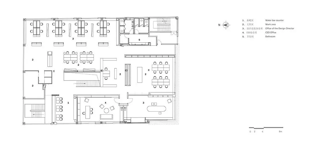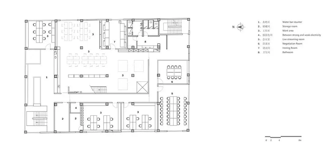 剥离掉面层装饰,保留最基本的空间单元。功能在水平轴线上以敞开的方式分布,利用家具自身的体量与尺度进行空间分割,在统一的材质下,模块化与可移动设计给空间带来一定的可变量,也给后续的局部调整预留可行性,敞开的方式使整个办公效率得以最大化。