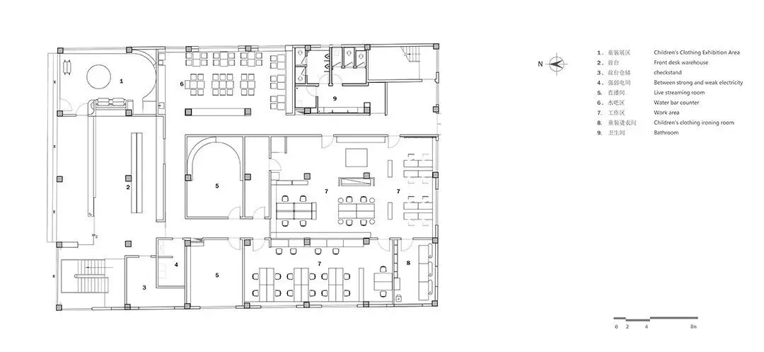设计需求为在这一四方体建筑内,设计一个可容纳百人左右的服装设计办公场所,人群密度与办公业态自身极强的功能属性给这一场所带来一种强烈的密度,在功能先行的条件下,设计开始展开。