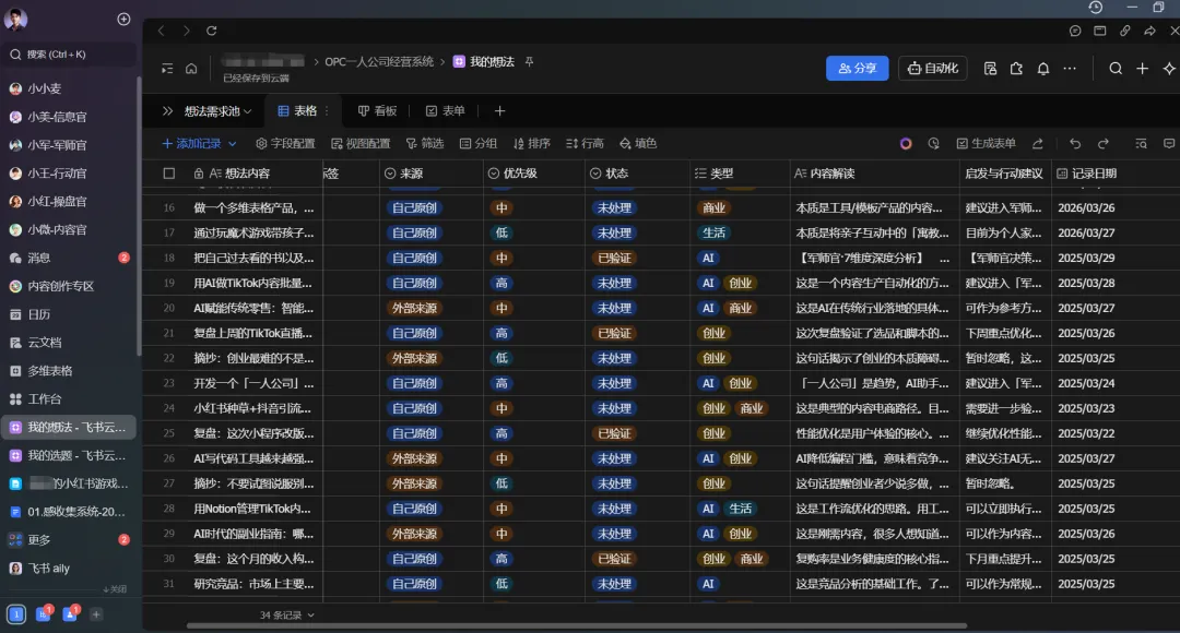 当前,OpenClaw跟飞书多维表格一结合,直接打通了一个我一直想做的场景:想法记录系统。