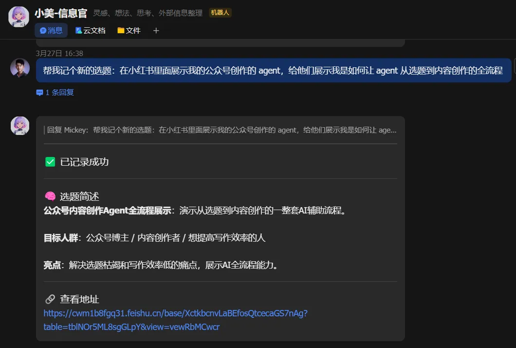 现在,当你看到一段话、一个想法、一个链接,直接丢给你的AI助理,让它帮你保存到知识做管理的多维表。它就能AI 自动帮你打标签、分类!