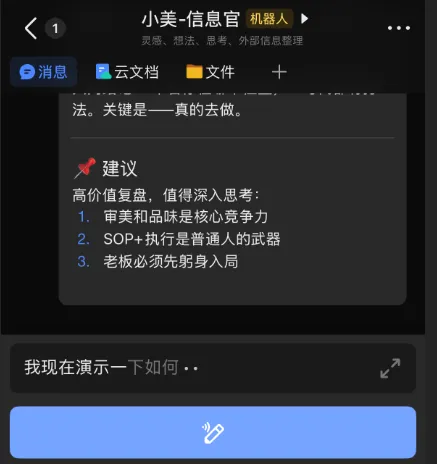 配合飞书内置的STT功能,长按按钮,直接语音转为结构化的书面文字,实在妙哉!!