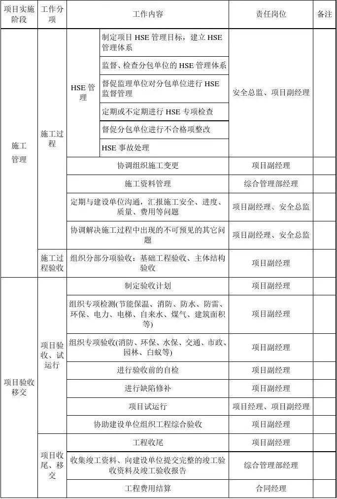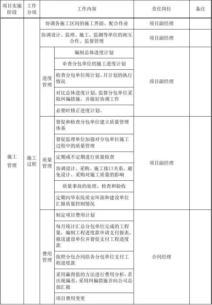 (a)施工阶段主要工作为完成土石方工程、地基基础工程、主体结构工程、装修工程、水电安装工程、室外道路管网等市政工程、景观绿化工程等工程项目的施工,进行施工过程质量控制、进度控制、变更控制、施工费用控制、施工安全、标化工地管理,分项、阶段验收管理,按要求的工期全面完成施工任务。