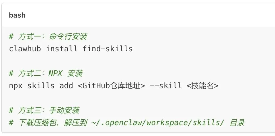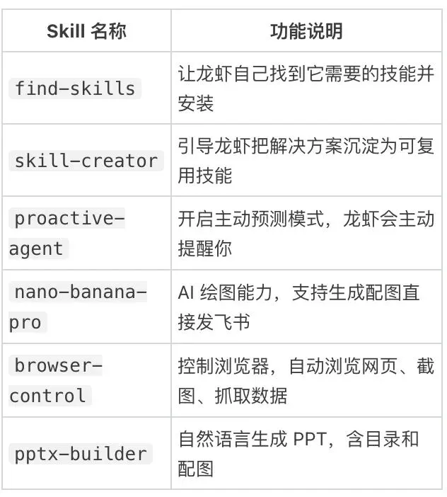 💡 建议先安装 find-skills,装完之后直接跟龙虾说"帮我找一个能做 XX 的技能",让它自己去搜索安装。