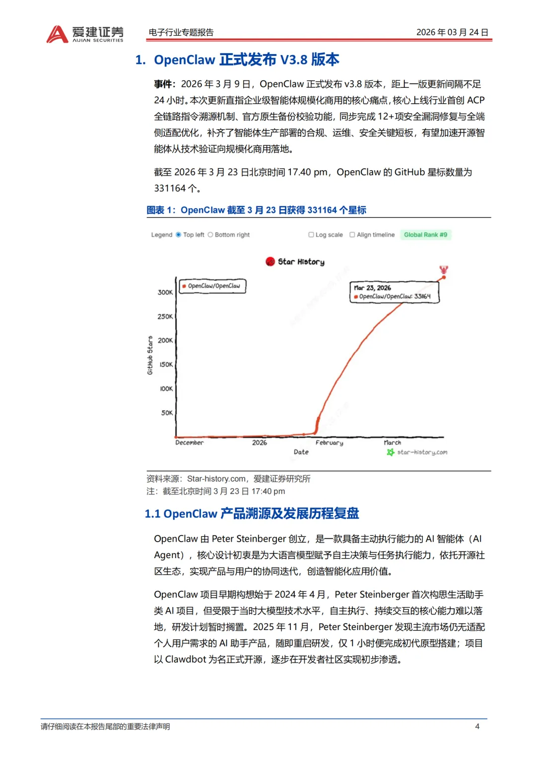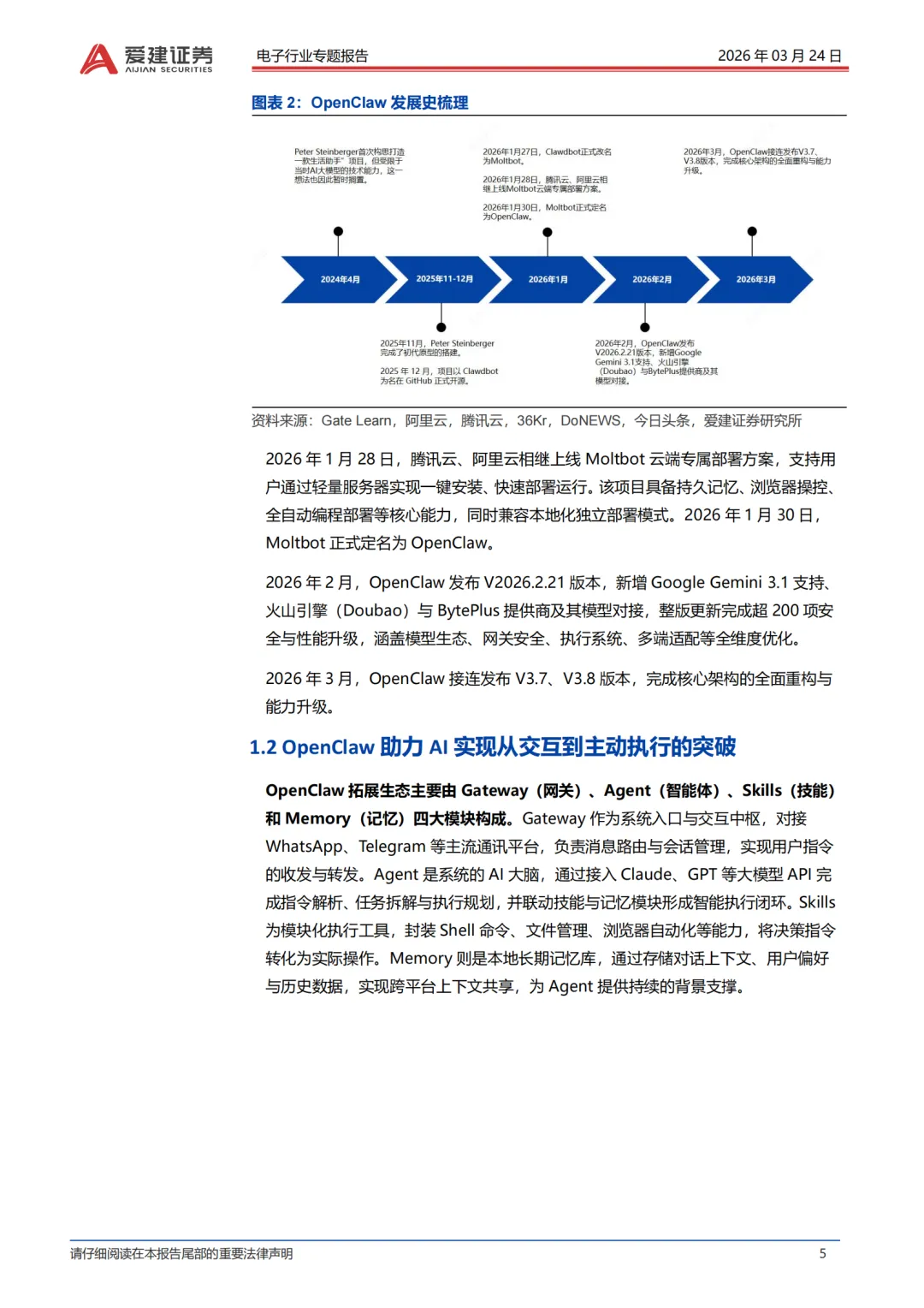 OpenClaw是由Peter Steinberger创立、具备主动执行能力的AIAgent(AI智能体)。其核心设计初衷是为大语言模型赋予自主决策与任务执行能力,同时依托开源社区生态,实现产品与用户的协同迭代,进而创造智能化应用价值。在发展历程上2025年11月,PeterSteinberger察觉到主流厂商尚未推出能充分适配个人用户需求的AI助手产品,于是重新启动该项目研发,项目初期以Clawdbot为名开源,在开发者社区实现了初步的渗透与传播。2026年1月获腾讯云、阿里云上线云端专属部署方案支持,同月正式定名为OpenClaw。2026年3月接连发布V3.7、V3.8版本,完成核心架构全面重构与能力升级。