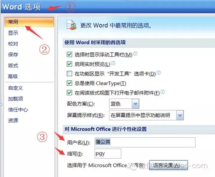 2.1.1 弹出的窗口“word选项”①→“常用”选项卡②→设置用户名和缩写③