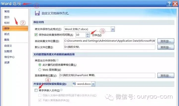2.1.1 弹出的窗口“word选项”①→“保存”选项卡②→保存文档③ 此处可设置,