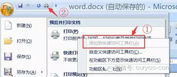 3.1 在任意按钮上“右击”,弹出的窗口选择“添加到快速访问工具栏”①,就会出现在②的位置,使用的时候会很方便。