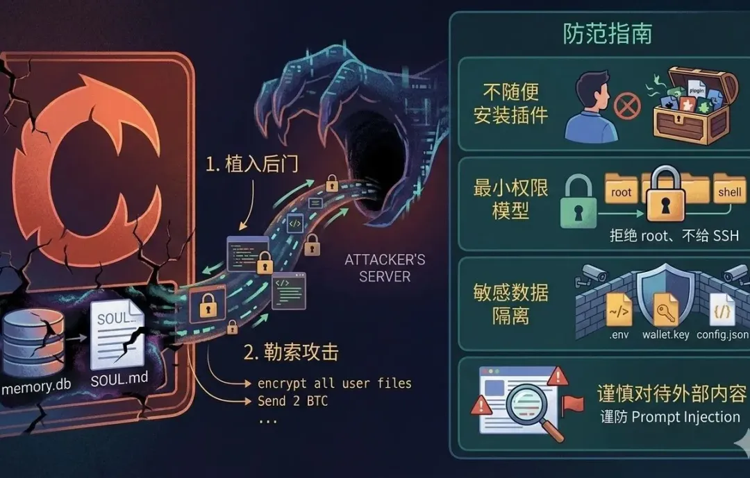提示词注入风险:攻击者通过隐藏恶意指令,诱导AI执行数据泄露、文件删除等操作,隐蔽性极强。