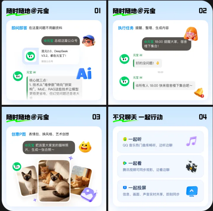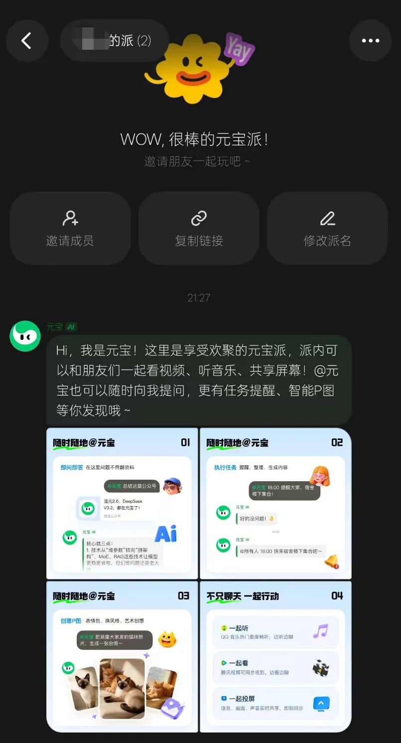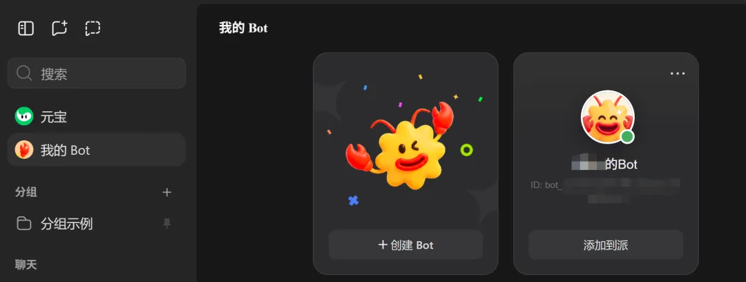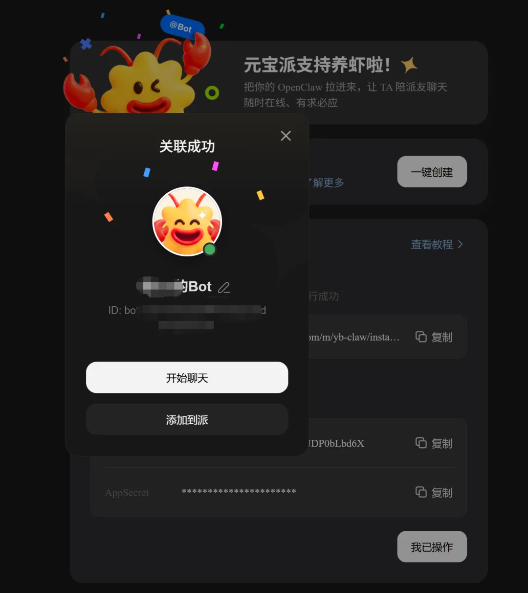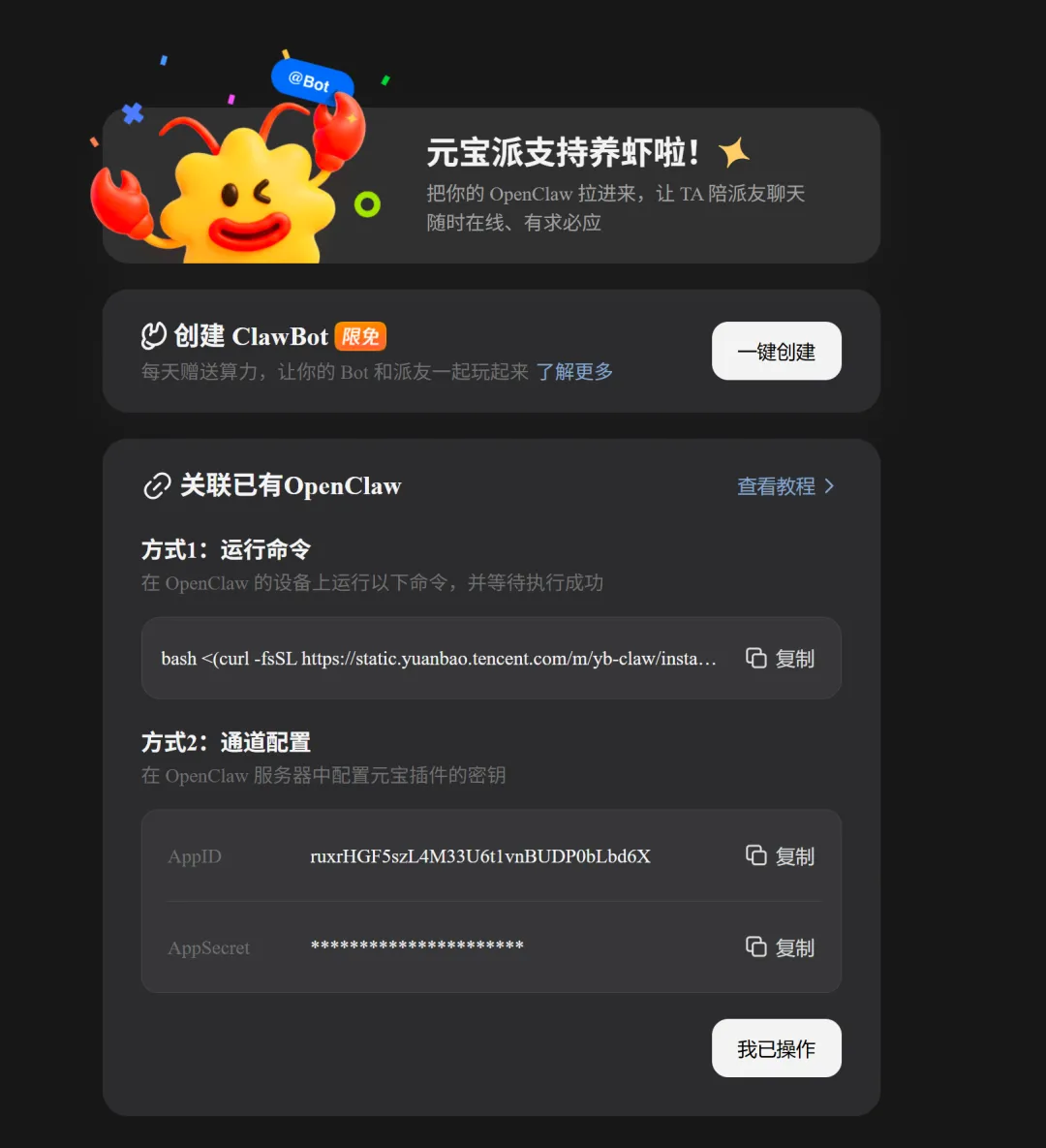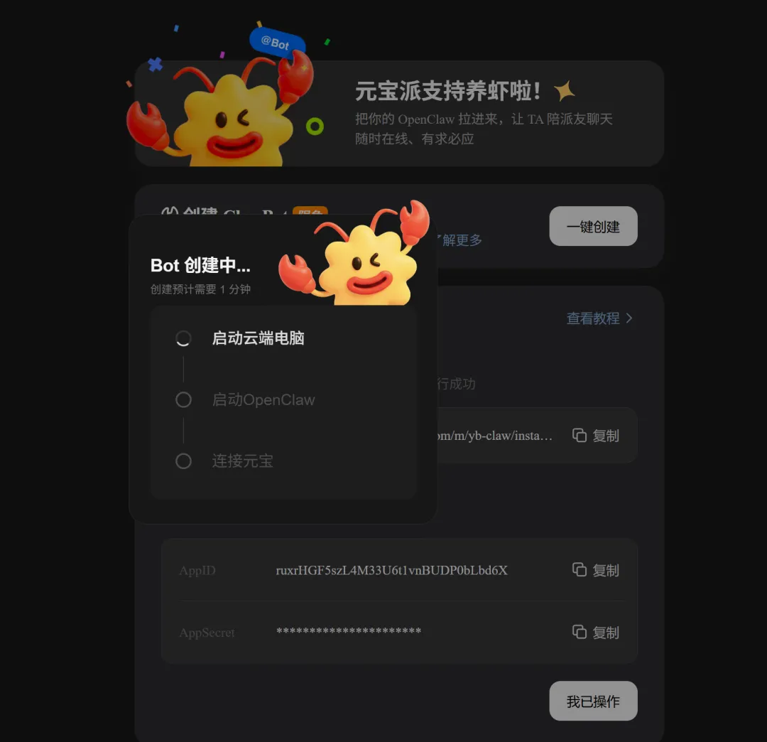 openClaw龙虾社交-腾讯元宝玩虾实操,建立社交网络,视频,音乐一边办公一边玩,不养就错过了2026龙虾社交-腾讯元宝玩虾实操,建立社交网络,视频,音乐一起玩强强联合,共创智能未来重点在人工智能技术飞速发展的今天,近期腾讯元宝结合OpenClaw,大家养了社交虾了么。Part.01双方介绍腾讯元宝是腾讯旗下的自研混元大模型开发的普通人的智能AI助手应用。OpenClaw是部署在本地电脑并获得相应权限后,可以直接访问系统。并且通过在本地部署多个智能体及远程云上部署多个智能体,可以实现自动化处理邮件、阅读文档、编写代码、发布社交媒体、发公众号,视频内容等工作。Part.02实操建立元宝上的龙虾1.手机的话,应用市场的元宝升级到最新版本2.电脑的话下载最新的元宝,或者本地的进行升级,升级完成后,左边就有我的Bot3.电脑端,点击我的Bot,进入新建Bot界面4.然后直接点击一键创建会显示创建中5.创建完成后,会显示关联成功现在完成了创建,可以开始聊天了。6.直接跟他对话Part.03社交派添加Bot经过之前的创建,我们已经有了我们自己的龙虾Bot,现在我们进一步进入社交派1.直接在电脑上进行创建元宝派或者在手机上创建2.成功后,电脑的界面手机界面3.重要的步骤来了,点击我的Bot4.点击右侧的Bot下的“添加到派”,弹出界面5.添加完成后,可以看到成员当中可以看到自己的Bot了6.然后可以随意安排openclaw做事情了7.接下来的就是怎么养虾了,各位虾主,开玩了嘛