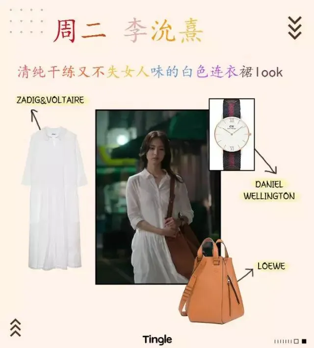 SBS水木剧《再次相逢的世界》李沇熹一身简洁的纯白衬衫式长款连衣裙。淡雅的颜色更突出清新低调的自然美。适中的长度,避免给人过于暴露的感觉,端庄而得体。质地较薄裙,虽然有一点小透,但也更清凉。纯白色连衣裙传统却不古板,清纯可人中还微微透着一丝性感,非常符合李沇熹自身的气质。因为裙子是纯白色,所以搭配了一个设计独特的棕色包包来增加整个look的亮点,以免颜色搭配过于单调。